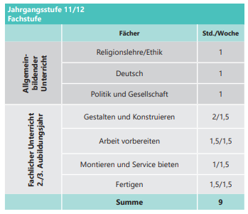 Beschulung im Berufsgrundschuljahr (BGJ) Schreiner in Vollzeit, mit Praktikumsmöglichkeiten in Schreinerbetrieben Beschulung in der zweijährigen Fachstufe im zweiten und dritten Ausbildungsjahr Moderne Ausstattung in unserer Schreinerwerkstatt mit hochtechnischen Geräten.